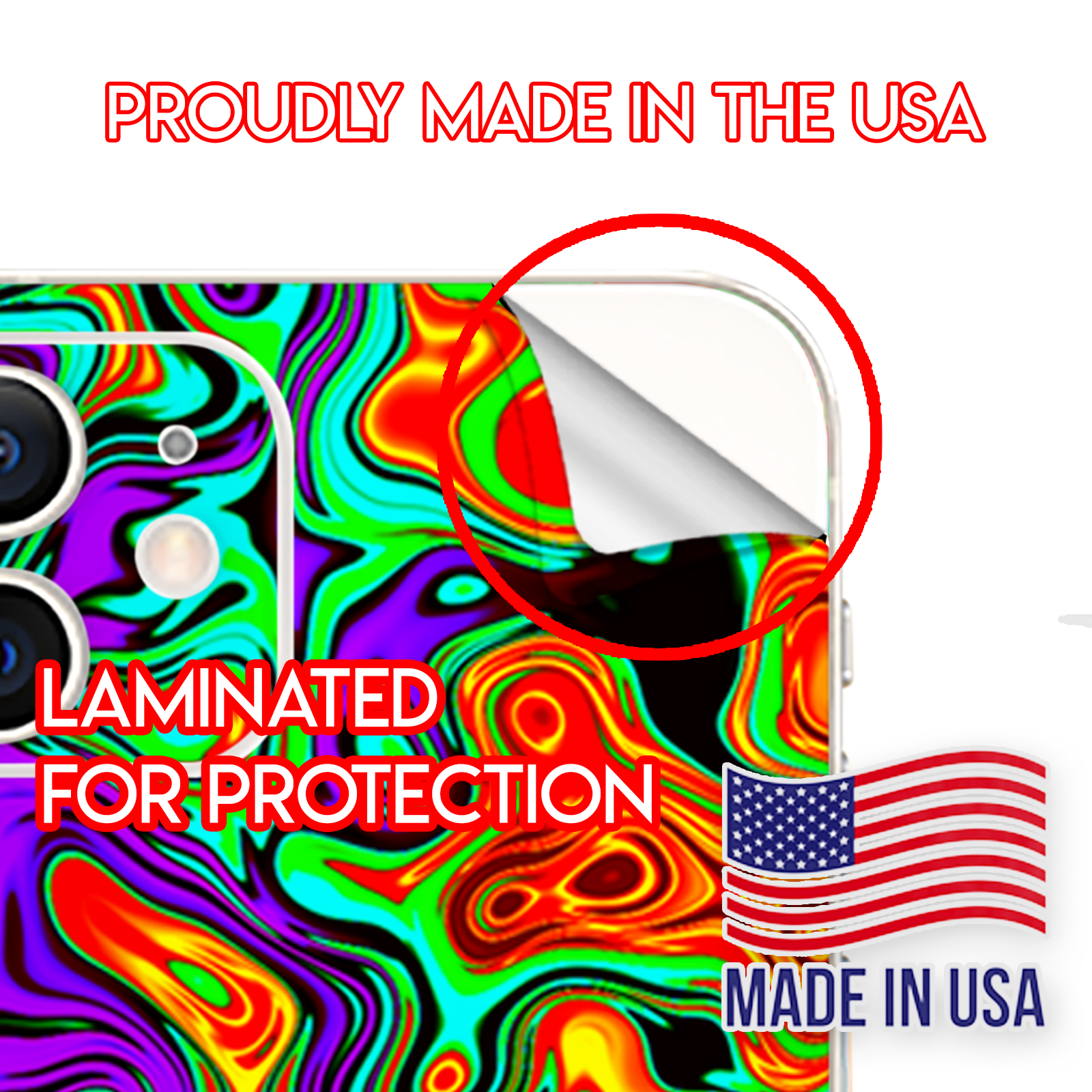 This Apple iPhone 12 Skin is Made in the USA using high quality vinyl. Super rich colors with a matte lamination provide a great look and added protection against minor scratches. Leaves no sticky residue behind.